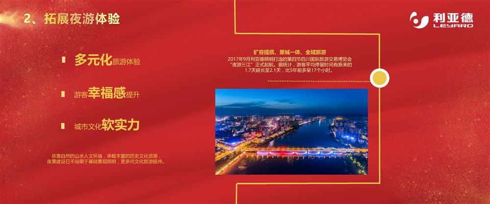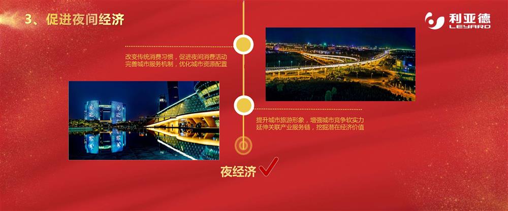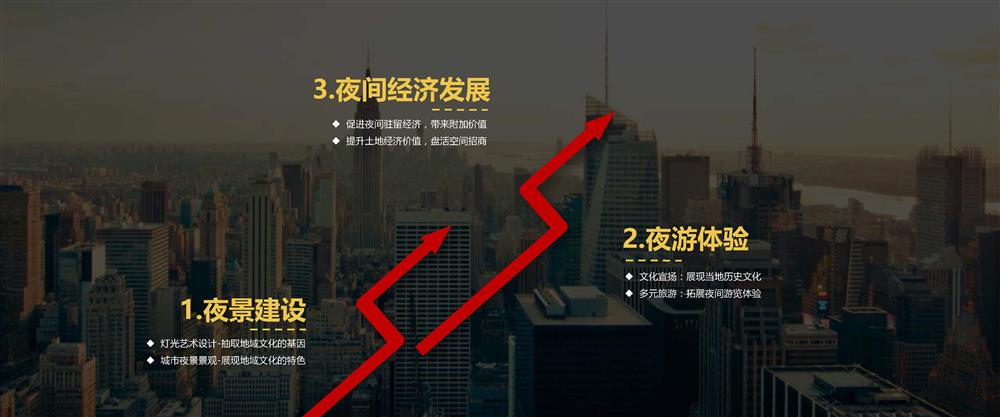 25 12 2019 來源: 照明板塊適用方向: 1、城市夜景建設(shè):燈光藝術(shù)設(shè)計-抽取地域文化的基因;城市夜景景觀-展現(xiàn)地域文化的特色! 2、拓展夜游體驗:文化宣揚-展現(xiàn)當?shù)貧v史文化;多元旅游-拓展夜間游覽體驗! 3、促進夜間經(jīng)濟發(fā)展:促進夜間駐留經(jīng)濟,帶來附加價值;提升土地經(jīng)濟價值,盤活空間招商!
